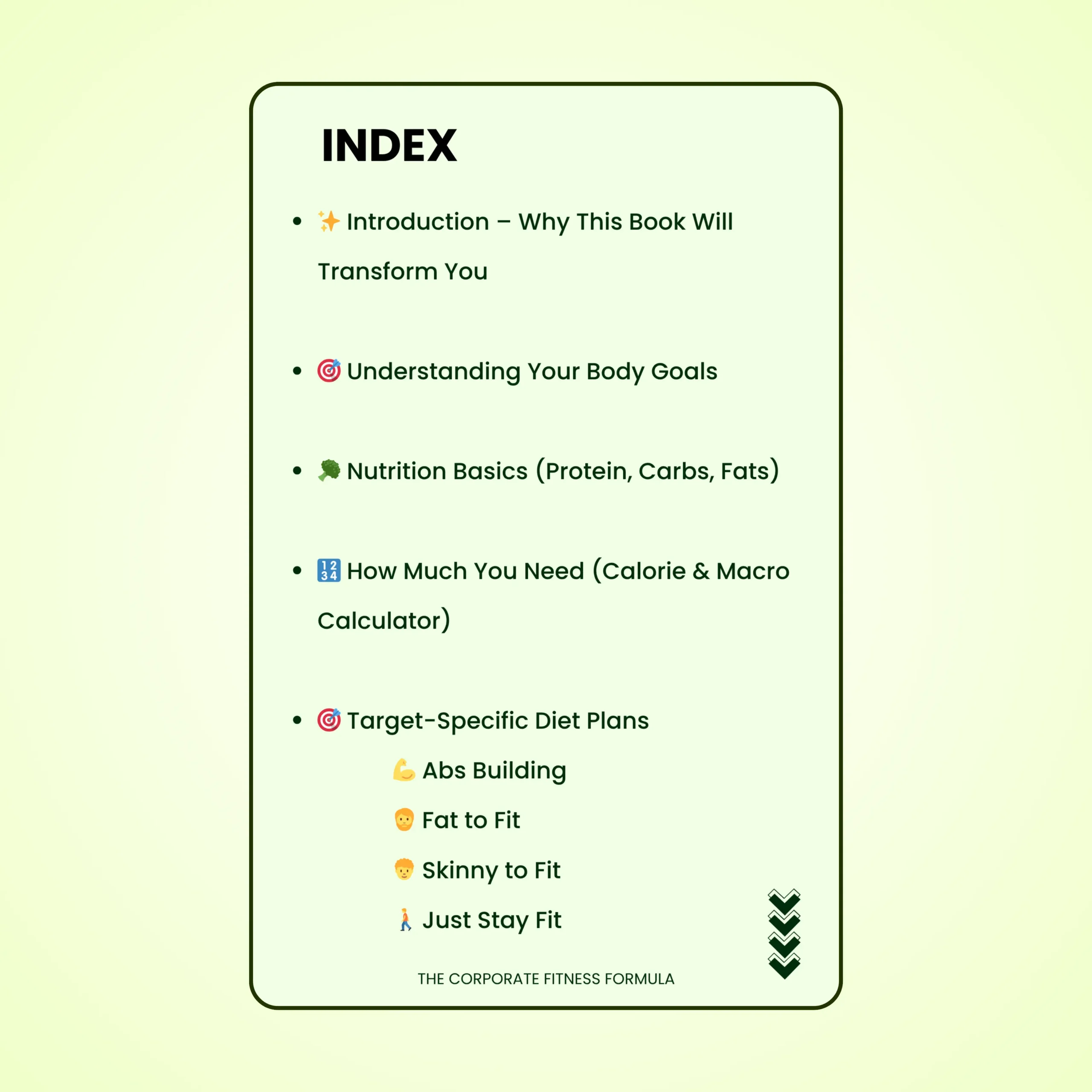 The Corporate Fitness Formula is not just another diet book — it’s a complete transformation guide for busy professionals, beginners, and fitness seekers. Whether you’re looking to lose fat, build muscle, or simply stay fit, this eBook gives you clear, actionable plans tailored to your goals.